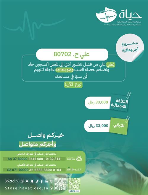 يُعاني علي من فشل تنفسي أدى إلى نقص اكسجين حاد وتضخم بعضلة القلب وهو بحاجة عاجلة لتنويم كُن سببًا في مساعدته