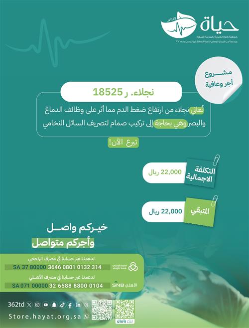 تُعاني نجلاء من ارتفاع ضغط الدم مما أثر على وظائف الدماغ والبصر وهي بحاجة إلى تركيب صمام لتصريف السائل النخامي